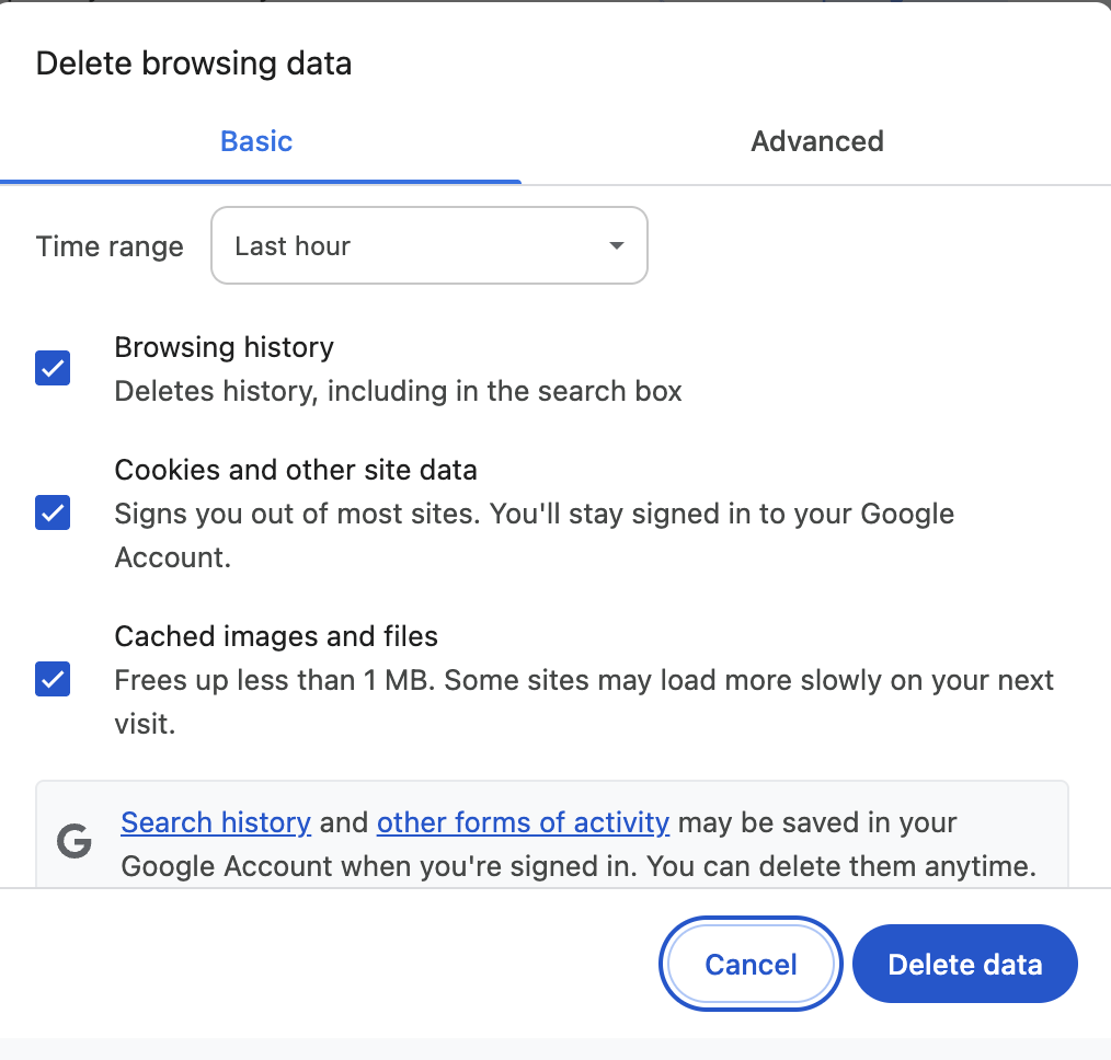 - In Google Chrome, go to Settings > Privacy and Security > Delete browsing data