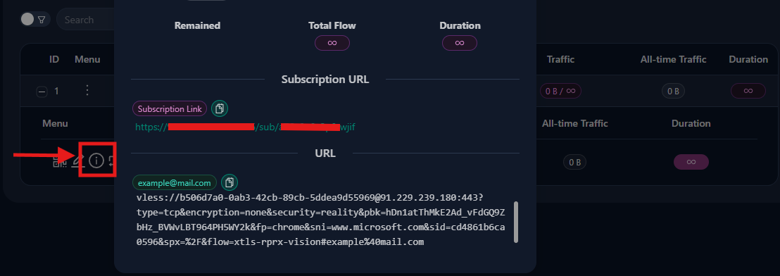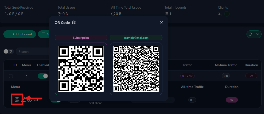 • Client QR (etichettato con l’email o identificatore del client, come example@mail.com) → un QR per l’URI VLESS Reality diretto