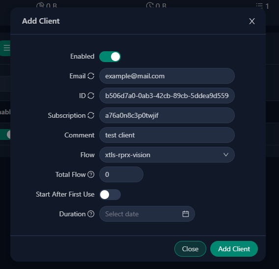 Ogni utente ottiene un UUID unico (generato automaticamente), insieme a un’email per identificazione e limiti opzionali di traffico/scadenza. Quando crei un client, il pannello genera i valori necessari per la connessione: indirizzo del server, UUID, flusso, chiave pubblica, ID breve e impostazioni relative a SNI.