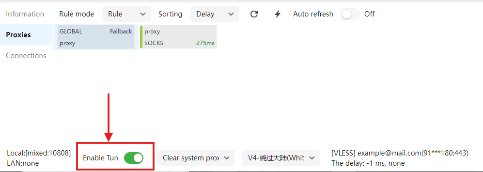 Dopo che il client è stato importato, per rendere attivo il tunnel tra il client Windows e il server, premi “Abilita tunnel” in fondo all’interfaccia di v2rayN.