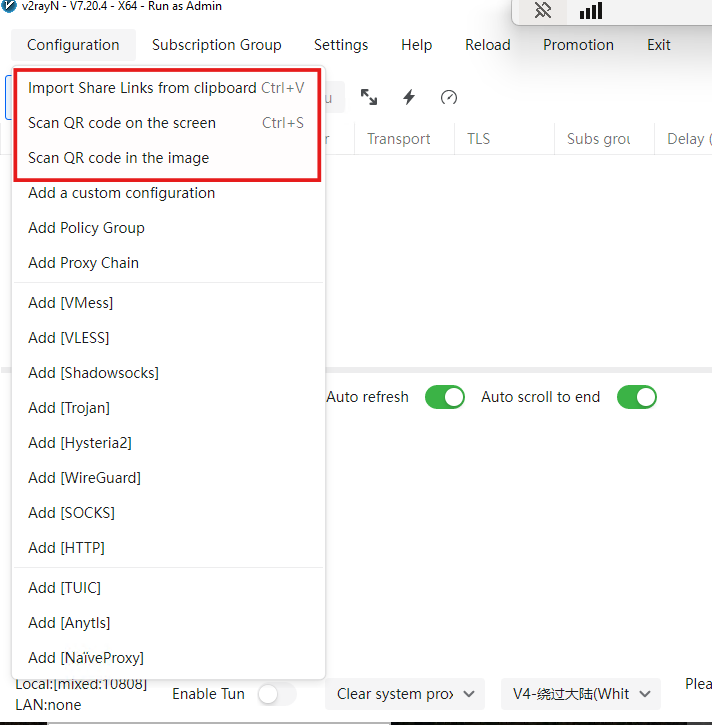 In v2rayN, apri il menu Configurazione nell’area in alto a sinistra della finestra. Il metodo più semplice è copiare l’URL VLESS diretto da 3x-ui e poi selezionare Configurazione → Importa Link di Condivisione dagli appunti. Nella maggior parte delle build, puoi anche semplicemente premere Ctrl+V. Assicurati di aver copiato prima l’URL VLESS diretto, in modo che l’app possa incollare il valore.