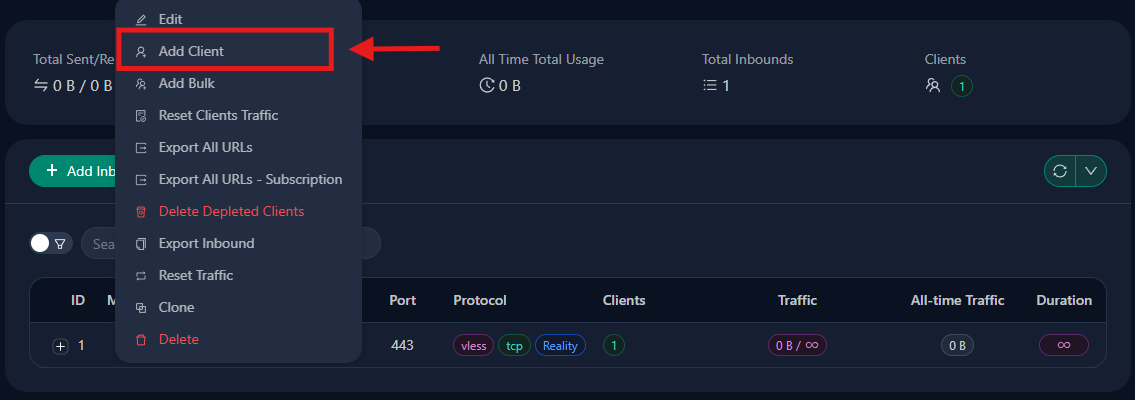 Con l’inbound configurato, devi creare connessioni utente che i tuoi dispositivi utilizzeranno per autenticarsi. In 3x-ui, naviga su Inbounds → [Fai clic sul tuo Menu VLESS inbound] → Aggiungi Client.